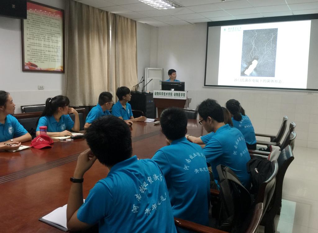 7月23日,队员们来到华中农业大学,举行了开营仪式,讲解了行程安排,明确了此行目的。7月24日-7月27日上午,队员们在华中农业大学动科楼B105会议室分别聆听了“家畜育种新技”、“兽医中药学概述”、“禽病的危害、净化与控制”等学术专题讲座。