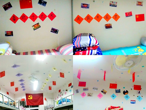 走进装扮一新的各个宿舍,扑面而来的是一种积极、健康的“红色”氛围,同学们利用手绘图案、趣味墙贴、毛笔字帖等多种方式使宿舍具有了浓厚的“十九大”氛围。天花板上精心布置的手绘红星、墙面上鲜艳的旗帜、同学们亲笔写下的真挚感言……无不体现着同学们自主进行宿舍文化建设的积极性和创造性。除了装饰宿舍,同学们还在宿舍推出了“十九大”学习板块,充分利用宿舍空间通过文字、图片等形式呈现中国共产党的光辉历程、中国共产党历次会议的基本情况。 看着自己精心装扮的宿舍,17级动物药学2班董焱斌同学颇有感触地说:“习近平总书记在十九大开幕式上所作的工作报告振奋人心,特别是对当代青年的嘱托和期待,让我们对肩上的责任和使命有了更明确的认识。”