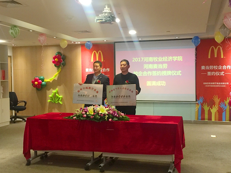 为推进产教融合、校企合作,12月14日,学校与河南迈乐加餐厅食品有限公司(麦当劳)签署校企合作协议并举行校外教学基地挂牌仪式。