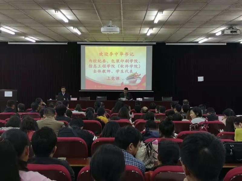 按照学校“不忘初心、牢记使命”主题教育安排,校纪委书记李中华带头学习、带头备课,于2019年10月17日下午,在英才校区E110教室,为校纪委、包装印刷学院、信息工程学院(软件学院)三个单位的全体教工和部分学生代表160余人上了一堂“不忘初心、牢记使命——坚守共产党人精神家园”主题教育专题党课。